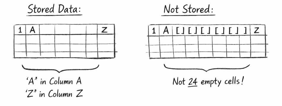 With those constraints established we began investigating options. An important feature of document-like spreadsheets we observed was that different sections tend to be separated by a region of empty cells, effectively forming “islands”. Discovering these islands and treating them as sub-sections appeared to be a promising approach, but we’d still need to address the runtime complexity issues noted above, and to do that we’d need to understand and leverage how spreadsheets store their data.