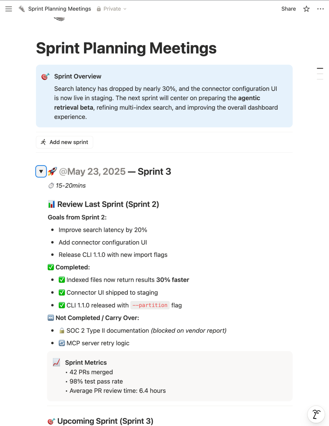 The document is structured with headings, bullet points, and icons for clarity, and it outlines past achievements and future goals related to sprint planning in a project management context.Example Notion connection and sample chunks from Ragie